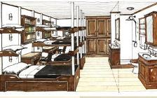 El interior de la goleta ha sido programado para acomodar al capitán en una cabina privada, 4 oficiales en cabinas dobles, 36 grumetes, (en cabinas de 4, 6 y 8 personas), y una tripulación fija de 6 hombres. Cada cabina cuenta con un baño completo dividido y armarios individuales para sus ocupantes. Los espacios, debido a la alta intensidad de ocupación son moderados en su volumen, pero contarán con una buena iluminación y ventilación. Las camas serán cuchetas tradicionales y el estilo de decoración y terminación marino será contemporáneo con algunos toques tradicionales.